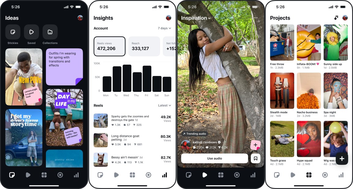 From there you will see five main tabs: Ideas, Inspiration, Projects, Record, and Insights. The Ideas tab offers creators a space to jot down ideas for new videos and save reels to a collection, and the Inspiration tab features a hub for discovering trending audios and other popular reels.