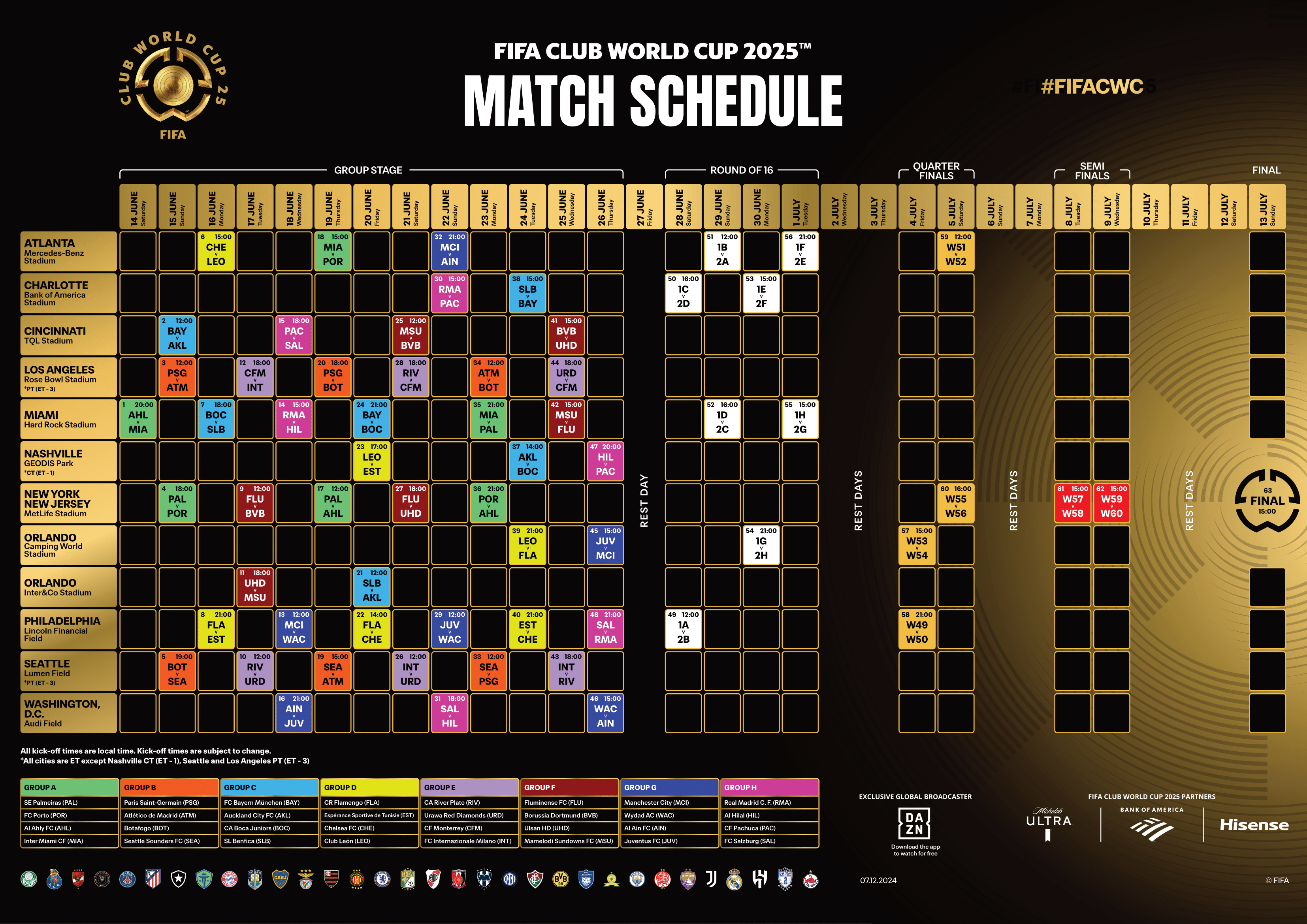 The 2025 Club World Cup takes place in the United States across 12 stadiums: