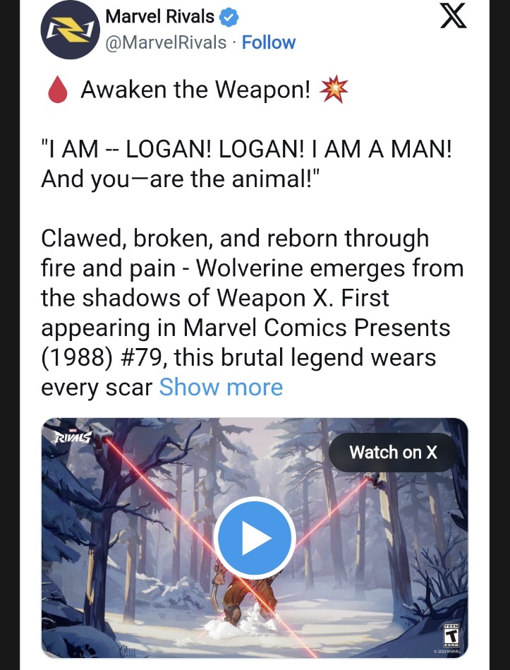 In a recent post on Twitter, NetEase Games gave players their first look at gameplay of the Weapon X skin for Marvel Rivals' Wolverine, which is coming to the game's store on June 5 at 7 PM PDT. According to the content creator Miller Ross on Twitter, Wolverine's Weapon X bundle is priced at 1,600 Units and will come with the skin, a nameplate, a spray, MVP animation, and an emote.