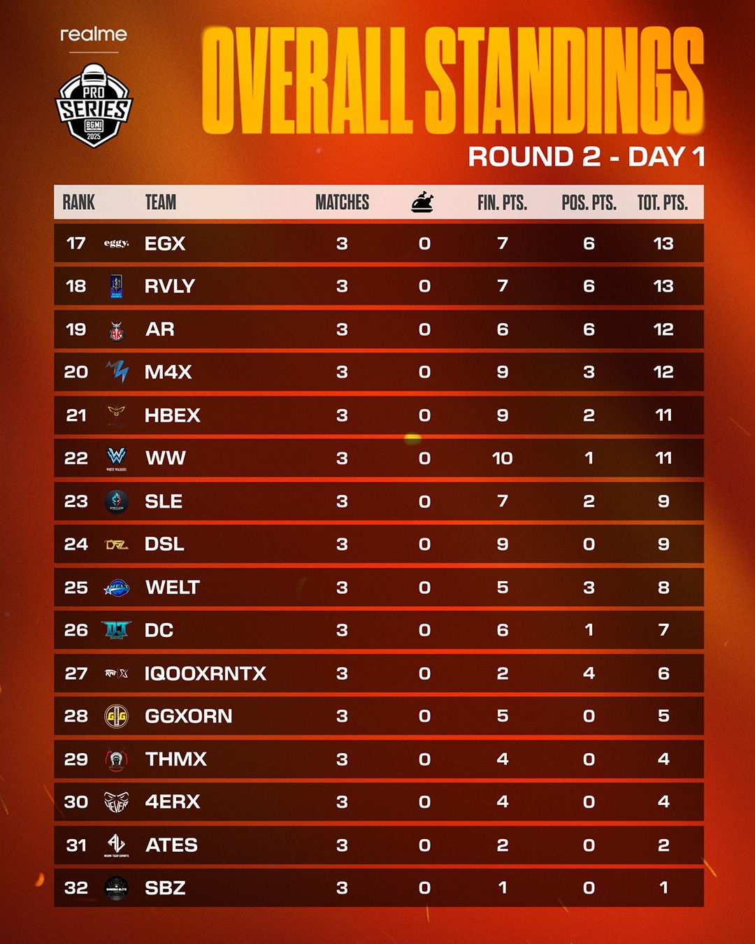 Golden Glider Esports was 28th with five points. THM and 4Everx were 29th and 30th, respectively. Assam Tiger Esports ranked 31st with two points, followed by Shadow Blitz in the last spot with only one. These clubs will aim for a comeback in their final three matches of BMPS Round 2.