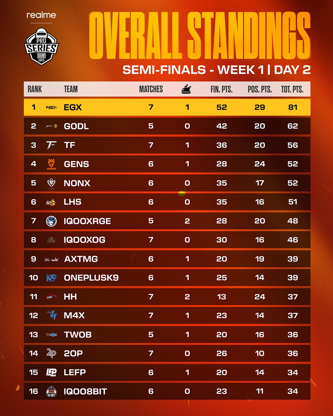 Team Eggy continued its stellar performance on Day 2 of the BMPS 2025 Semifinals Week 1 and remained at the top of the overall rankings. The team collected 81 points and one Chicken Dinner in their seven matches. GodLike jumped to the second spot on Day 2 with 62 points despite not winning any Chicken Dinners in their five matches.