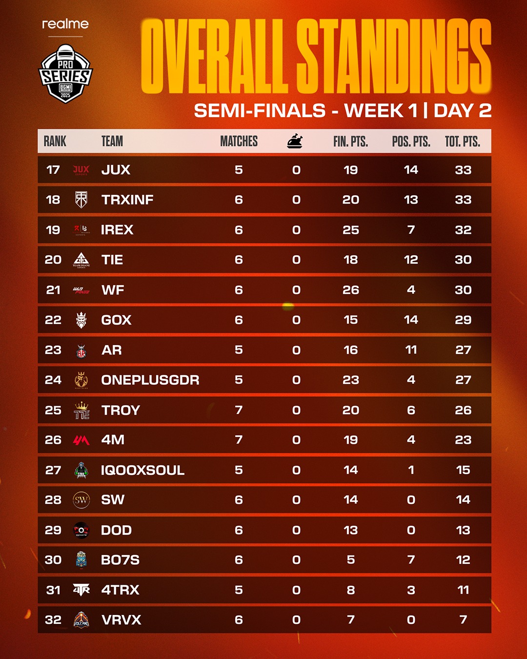 Gods Reign had another bad day as the Destro-led squad earned only 27 points in their five matches. Team Soul also failed to improve their performance on Day 2 and ranked 27th in the scoreboard with 15 points. Volcano was 32nd with only seven points after Day 2 of the BMPS Semifinals Week 1.