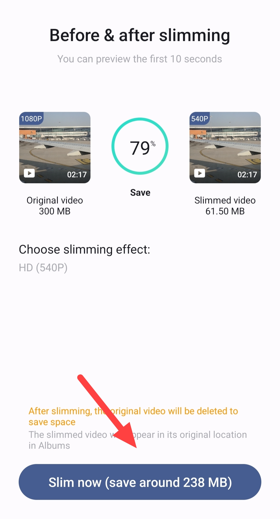 6. Here you can check the file size before and after slimming. Click on Slim now option below.