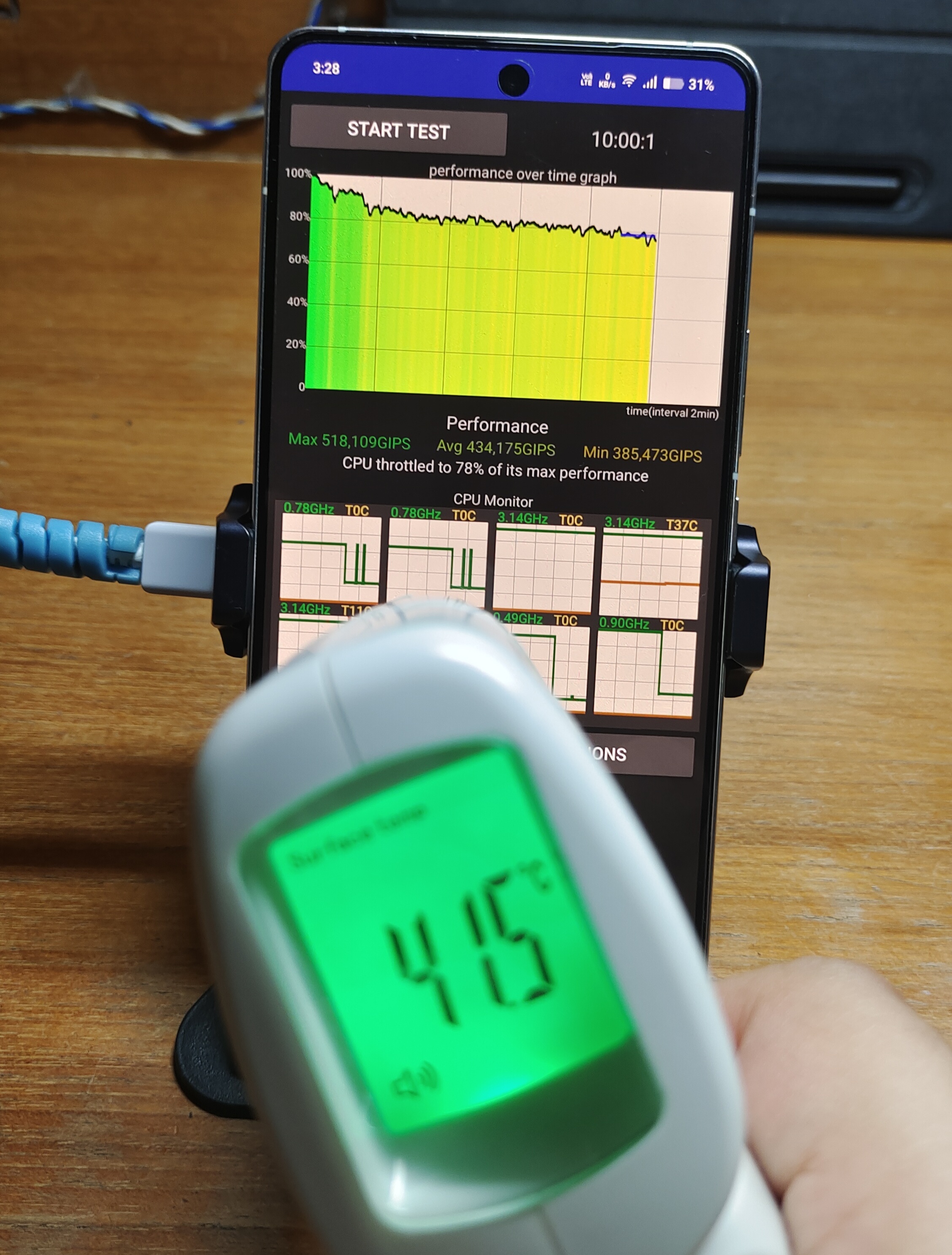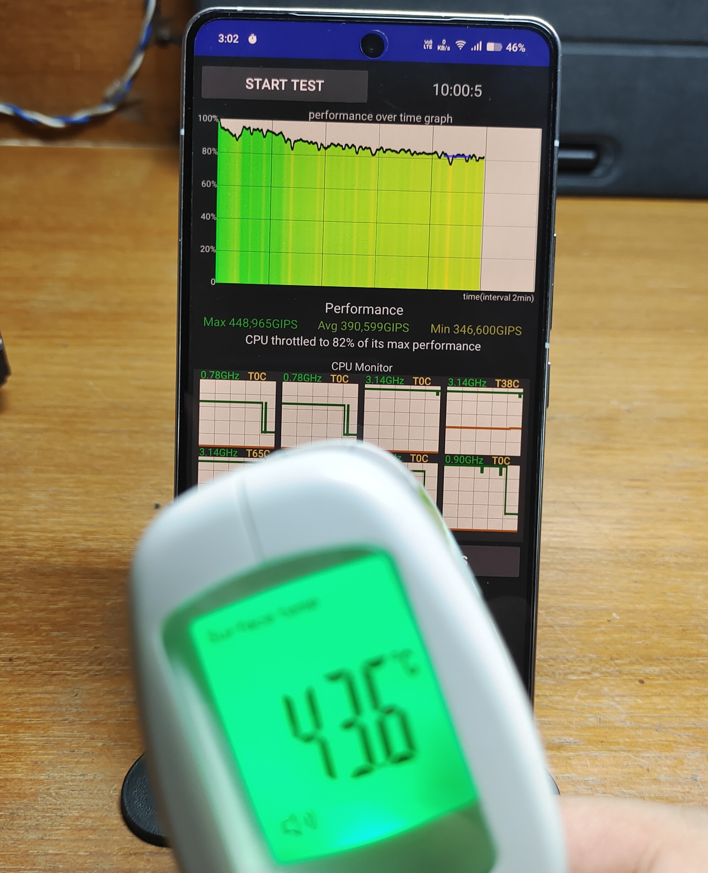 Now lets begin the Test and check the Temperature again. The phone temperature is now same as ambient temperature I'll let the cpu test run for 10 mins at the same configuration as previously.